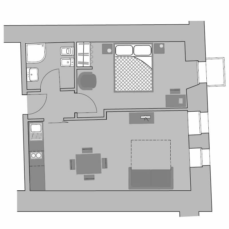 Confortevole appartamento bilocale a cui si accede tramite rampa di scale interna.