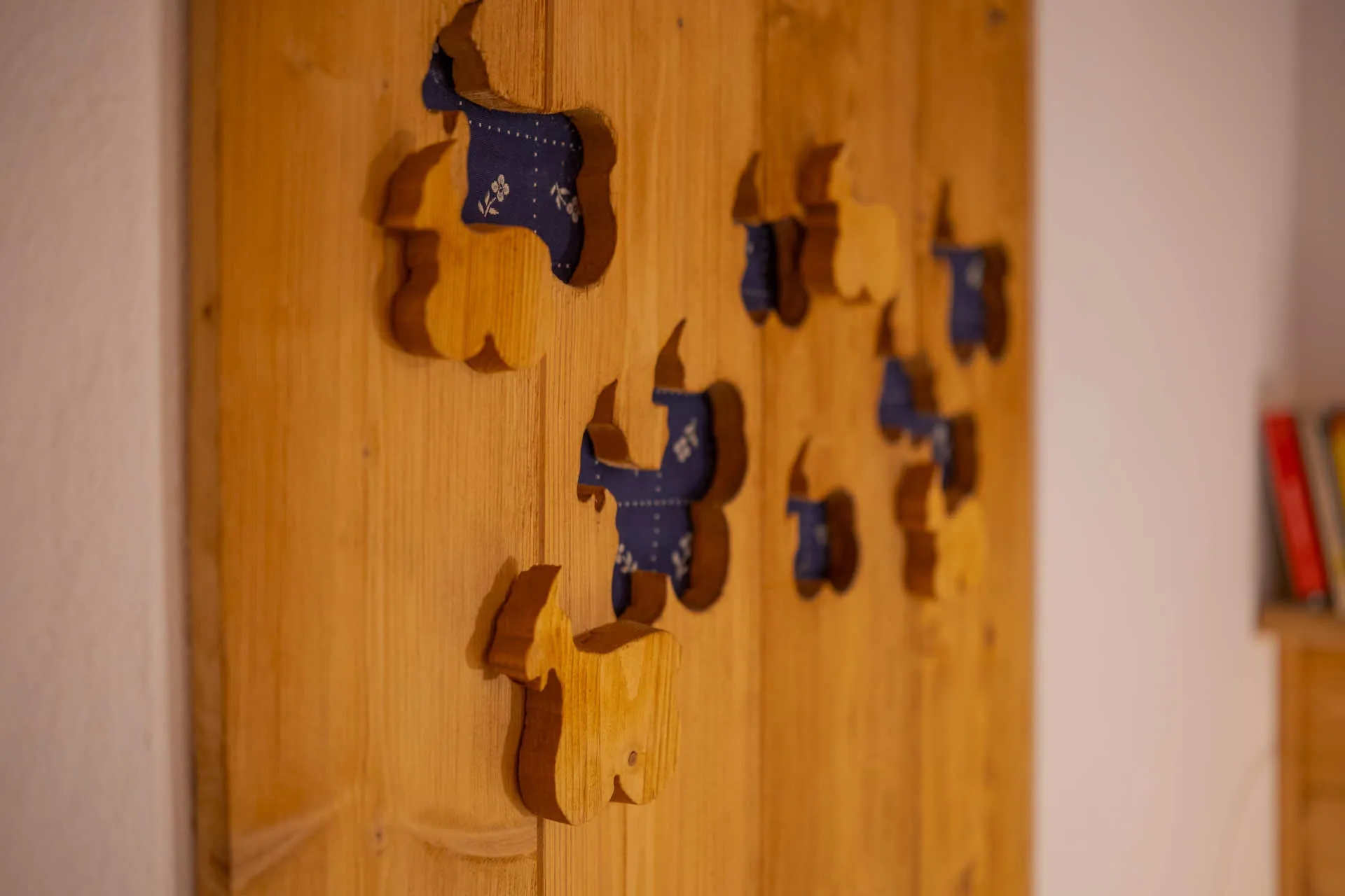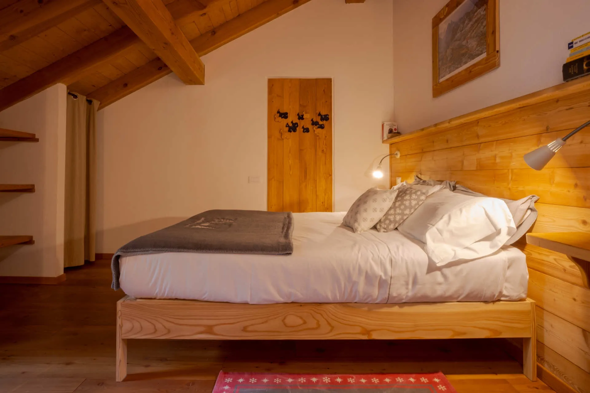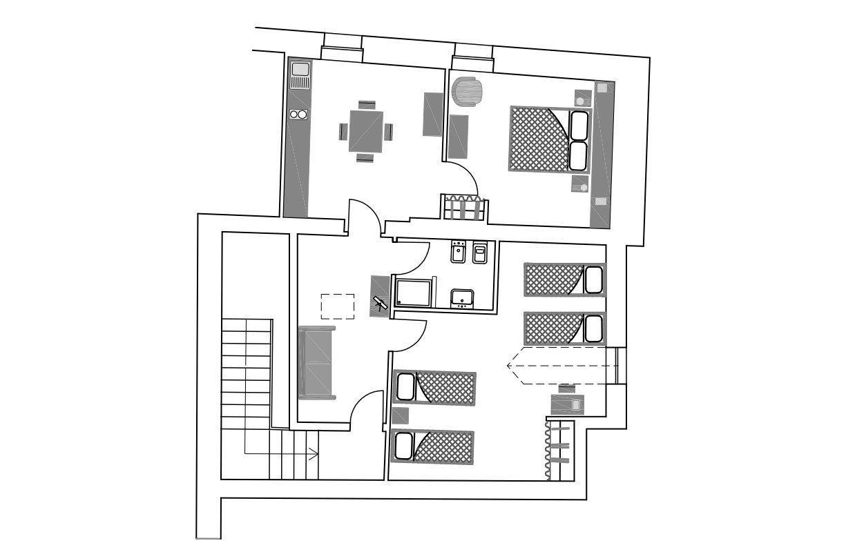 Una camera con letto matrimoniale da 160 cm, una camera con quattro letti singoli da 80 cm, con armadio a muro e scrivania e cassettiere. Ampio ingresso con zona divano e SMART TV 32".